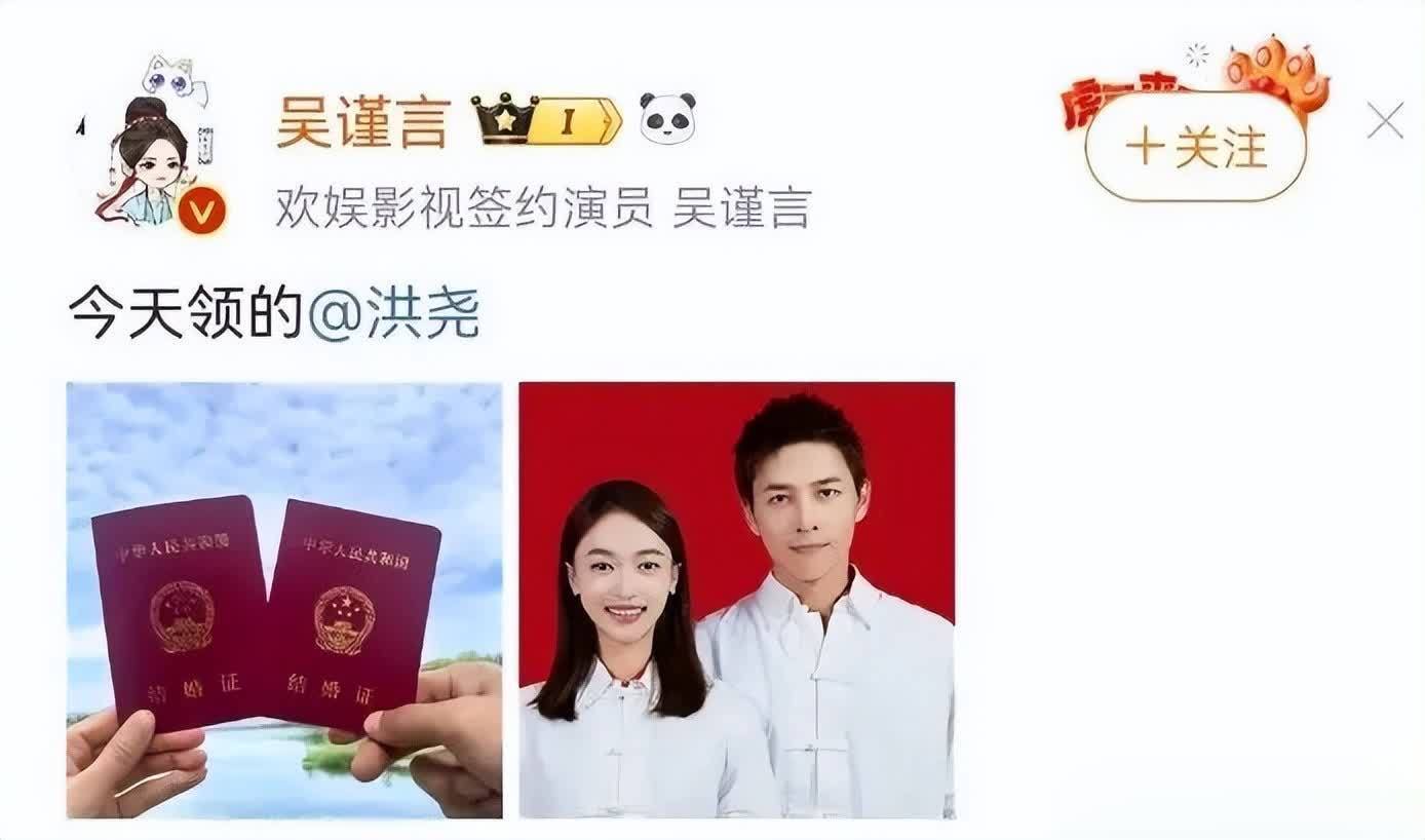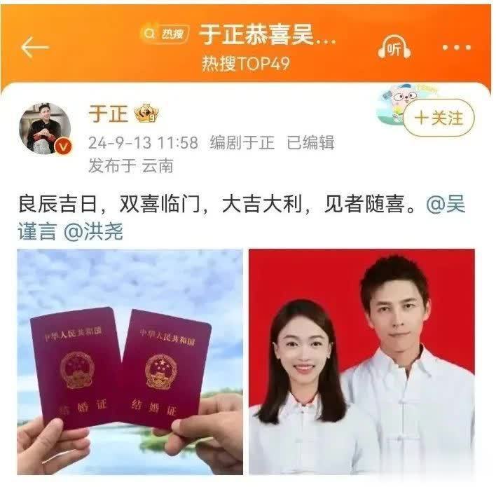 2024年9月13日,吴谨言和洪尧突然在微博晒出结婚证,官宣结婚。